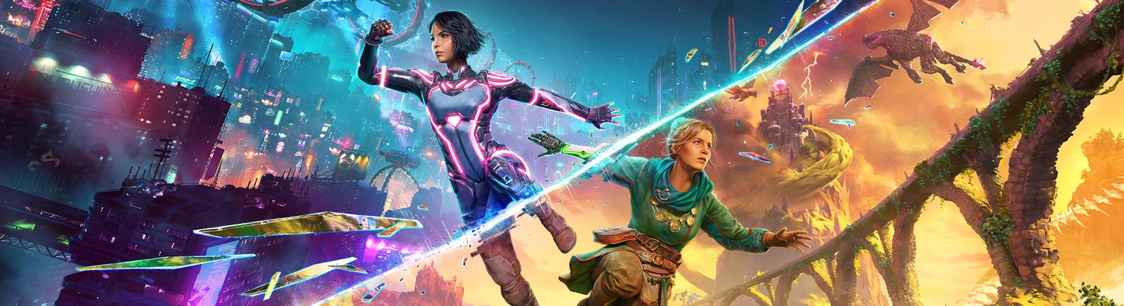 Split Fiction – сюжетна кооперативна пригода. Гравцям належить приручати драконів, тікати від тролів і битися з роботами, керуючи дуетом Міо і Зої – письменниць, яких затягнуло у власні історії. Одна обожнює наукову фантастику, а інша – фентезі. Щоб вибратися зі світу своїх творів і повернути спогади, героїні мають навчитися працювати разом.