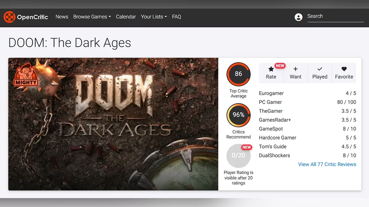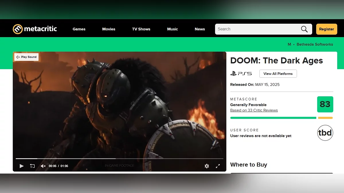 Сьогодні спало ембарго на огляди Doom: The Dark Ages, і критики опублікували свої враження від гри. На момент написання новини брутальний шутер отримав 83 бали на Metacritic і 86 балів на OpenCritic.